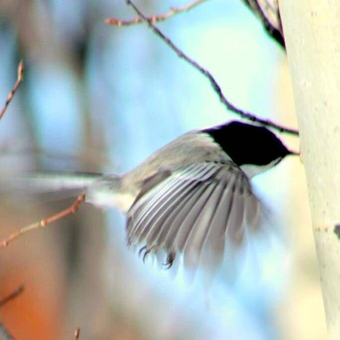 A Black-capped Chickadee soaring through the air foraging for food during late winter. Fairbanks, Alaska.