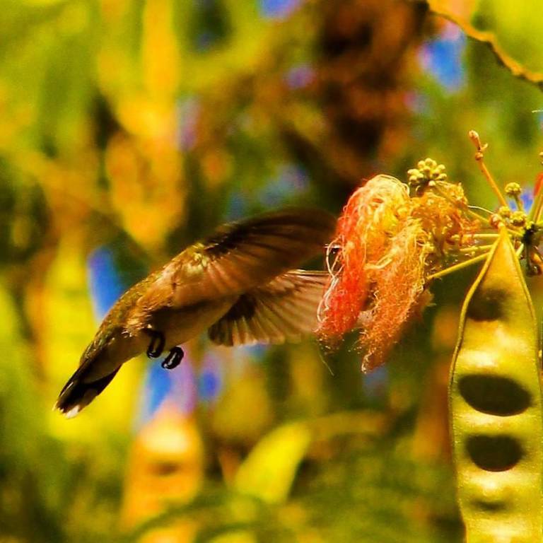 Female ruby-throated hummingbird pollinating a mimosa flower.