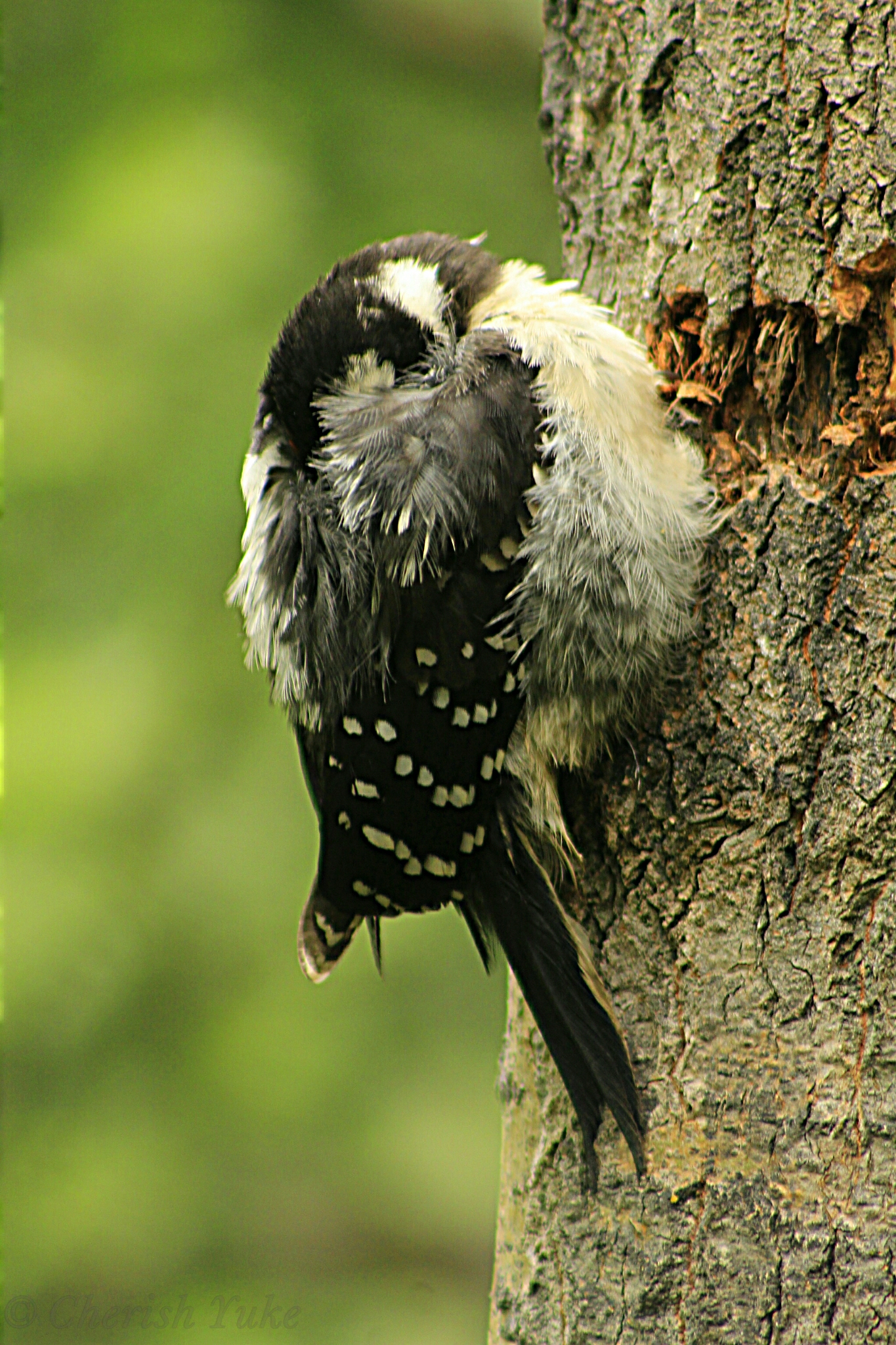 As I was walking by, I noticed this cute juvenile downy woodpecker sleeping on the side of the tree. Fairbanks, Alaska. So cute, I had to share!